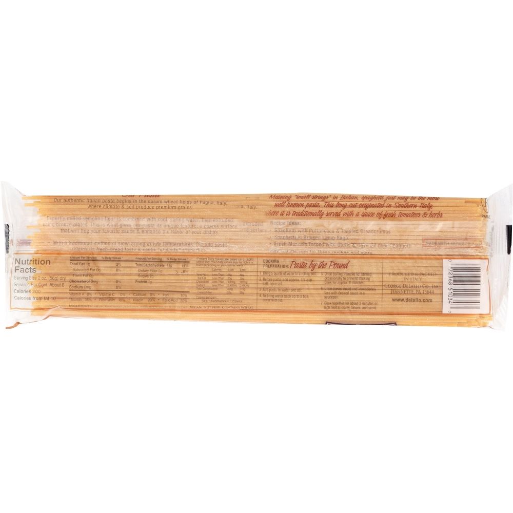 Delallo Spaghetti Pasta gives its unique texture: a coarse surface that will hug your favorite sauce and enhance the flavor of your dishes. With a traditional method of slow drying at low temperatures, DeLallo Pasta retains its fresh-bread taste and cooks al dente every time. Meaning "small strings" in Italian, spaghetti just may be the most well known pasta.